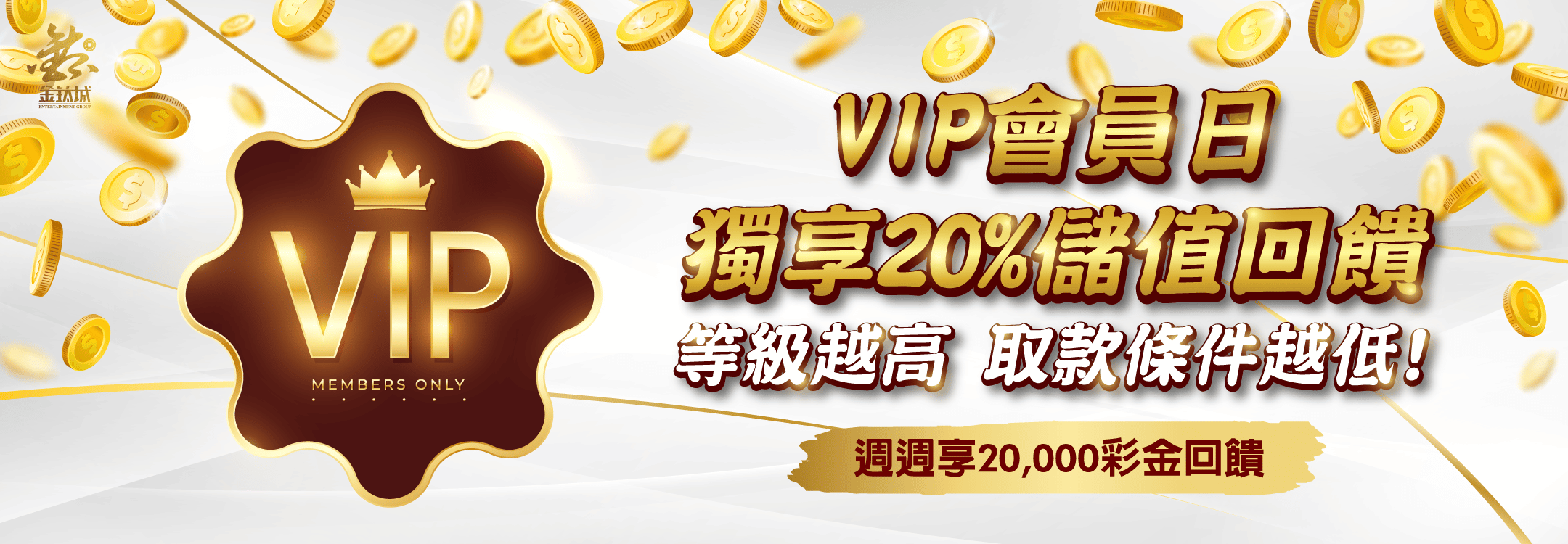 VIP會員於每週四完成儲值後,即可向VIP客服申請儲值金額*20%回饋。當您的VIP等級越高,綁定流水越低!